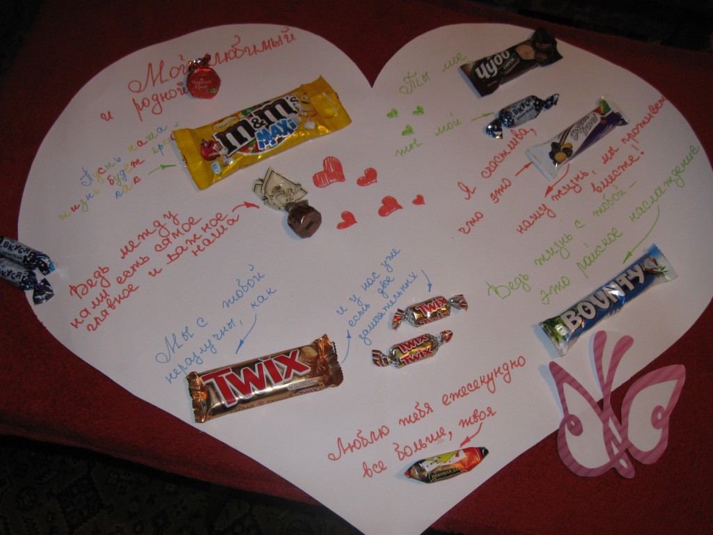 Мой любимый и родной Черный граф! Пусть наша жизнь будет яркой, как M&Ms Ведь между нами есть самое главное и важное, наша AMOUR Мы с тобой неразлучны, как Twix и у нас уже есть двое замечательных Twix - ков Ты мое Чудо, ты мой ВКУСЯ Я счастлива, что это Sweet Travel - нашу жизнь, мы проживем вместе! Ведь жизнь с тобой - это райское наслаждение BOUNTY Люблю тебя ежесекундно все больше, твоя Пиковая дама