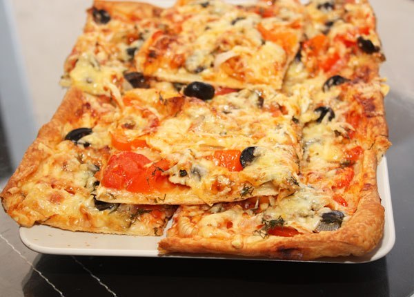 Я точно не подскажу, в последний раз готовила на купленном слоеном дрожжевом тесте, его понадобилось 500гр, взяла тесто, раскатала на противне, смазала томатной пастой, добавив в нее базилик, розмарин и другие травки. Сначала на пиццу выкладываю лук полукольцами, затем красную паприку, помидоры, маслины и все затираю сыром. Ставлю в духовку на 30 минут и все готово.