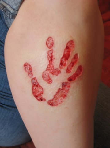 Так и есть, это просто открытая рана, кожа срезана, так сказать свежачок, а когда заживет, тогда и шрамы в форме ладони останутся.