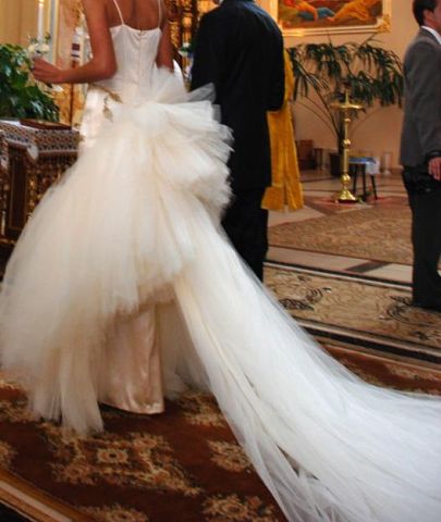 И таки странное. Я таких экспериментов не понимаю. Куча непойми чего пришита к очень простому платью. И к этому всему приделан длинный шлейф... Я бы такое не то что не одела, но даже не посмотрела в его сторону, разве что как на полную нелепицу.