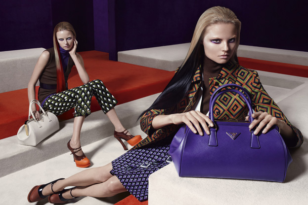 Cезон публикации рекламных снимков коллекций модных брендов сейчас в самом разгаре и модный дом Prada не остался в стороне. На днях стартовала рекламная кампания новой женской коллекции Prada осень-зима 2012-2013. В этой линии представлена не только одежда, а и лакированные туфли, принтовые сумки, очки с оригинальными оправами и головные уборы. Коллекция сделана в футуристической тематике: геометрические принты, психоделическая мозаика, яркие цвета – оранжевый, красный, желтый, горчичный, фиолетовый, розовый. Линия представлена разнообразными жакетами, рубашками, длинными юбками, пальто, а также короткими прямыми брюками. На снимках, задуманных, как виртуальный лабиринт блистают модели: Иселин Стейро (Iselin Steiro), Эльза Лёйендейк (Elza Luijendijk), Ванесса Аксенте (Vanessa Axente) и Мэдисон Хедрик (Madison Headrick).