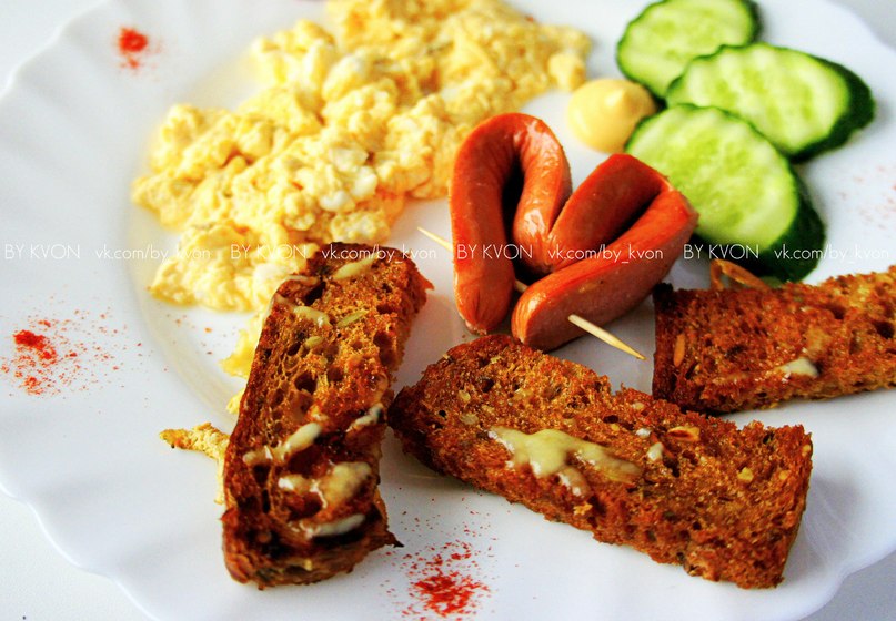 Отличный завтрак получается из омлета, сосиски и греночек, вкусно, быстро и сытно