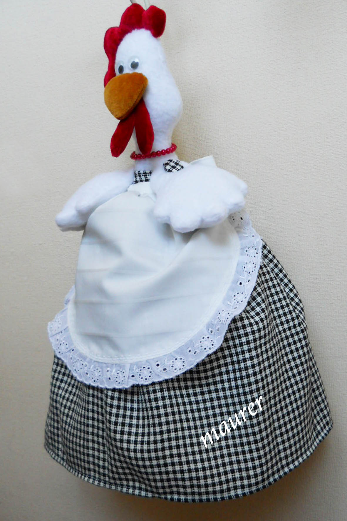 Подробности о пакетницах... Верхняя часть может выглядеть по-разному.Это может быть конопатая рыженькая девочка,пушистая заинька,деловой гусь,милая кошечка,забавная коровка,важная курочка или то,что Вы захотите. А нижняя часть-юбка и есть пакетницей. Вид сзади,ниже пояса фартука находится отверствие,в которое складываются пакеты-маечки с частотой раз в несколько месяцев. Вложение: