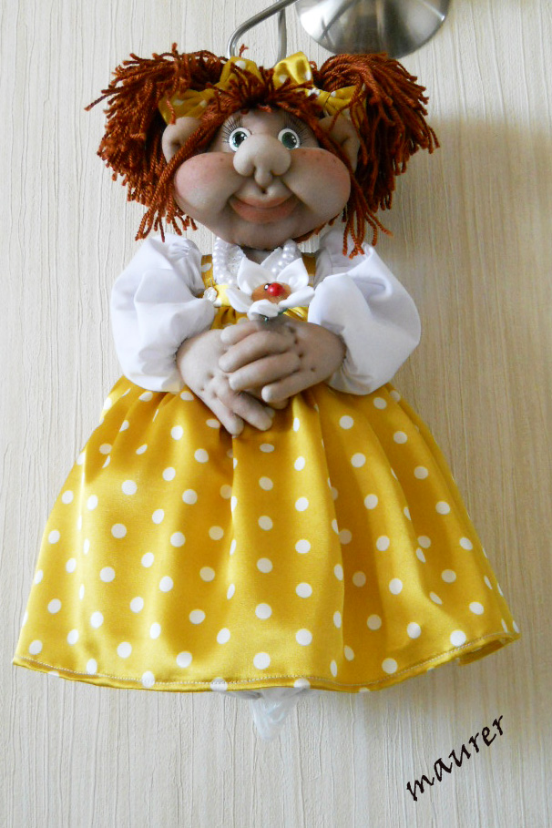 Подробности о пакетницах... Верхняя часть может выглядеть по-разному.Это может быть конопатая рыженькая девочка,пушистая заинька,деловой гусь,милая кошечка,забавная коровка,важная курочка или то,что Вы захотите. А нижняя часть-юбка и есть пакетницей. Вид сзади,ниже пояса фартука находится отверствие,в которое складываются пакеты-маечки с частотой раз в несколько месяцев. Вложение: