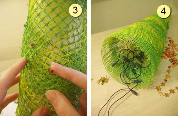 Это елка из флористической сетки, которую используют для оформления букетов. Для основы-каркаса можно использовать или ватман, или например кусок шпалера на изнанку. Клей используется обычный ПВА. Если он очень густой, его можно развести обычной водой, свойства от этого не меняются. Ткань-сетку замачивать не надо, лиш слегка промокнуть. Этого должно быть достаточно. Гирлянду внутри можно закрепить с помощью канцелярских скрепок или же проволоки. Единственной загадкой для меня так и осталось, как снять высохшую елку с бумажного каркаса.