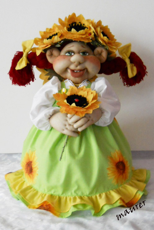 Ульянка кукла-грелка. Высота 50см. Материалы: бязь, поплин, капрон, синтепон, ватин. Подсолнухи сделаны из ткани. Способ для меня новый, но и процесс и результат мне понравился. Вложение: