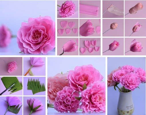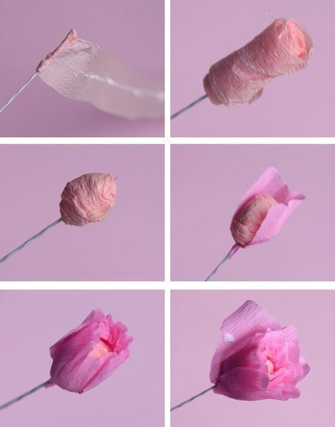 А мне понравилась вот такой цветок из гофрированой бумаги. Потребуется гофрированая бумага розового и зеленого цвета, проволока. Правда, пока не придумала, где такой цветок можно применить.