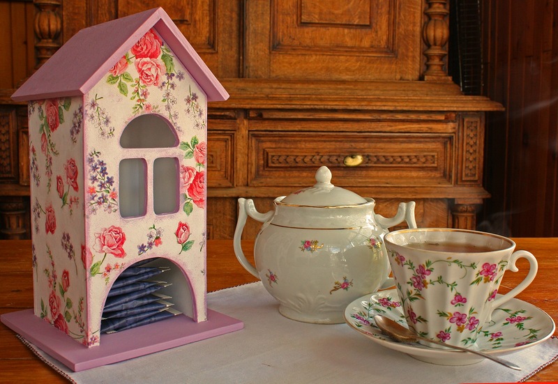 Идея действительно оригинальная, но не в моем вкусе. Мне больше нравятся вот такие чайные домики. Крыша такого домика снимается и он наполняется пакетиками. Домик можно сделать самому из плотного картона. Но если архитекторских способностей у вас маловато, то можно такой домик-заготовку из дерева приобрести в магазине. С помощью губки домик покрывается белой акриловой краской. После высыхания декорируем домик декупажными салфетками на свой вкус. можно еще прикрепить цветочки, ленточками и т.п.