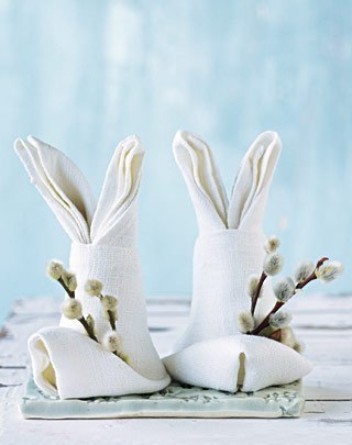 А я сегодня купила очень красивые салфетки на стол на Пасху. А у кого есть тканевые , то можно сложить в виде вот таких прикольных зайцев.