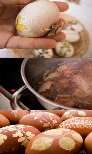Очень интересно выглядят яйца с листочками! А я нашла еще идеи для пасхального венка: