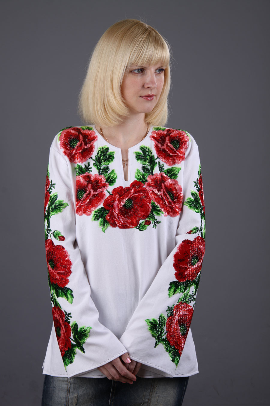Понравились эти сорочки вышиванки. Вернее, понравилась только сама вышивка - это вышивка бисером. А покрой блузки - это кошмар. Может они просто модель для показа выбрали неудачно, или действительно с фасоном промахнулись. Но она висит на девушке как мешок. А сама вышивка бисером мне очень нравится, особенно с маками. Я знаю, что сейчас продаются такие наборы - четыре отрезы ткани с нанесенным рисунком-схемой. Ты их вышиваешь, а потом уже шьеш сорочку.