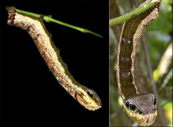 Гусеница-змея обладает отличным защитным механизмом, который позволяет ей перевоплощаться в гремучую змею. Во время опасности она цепляется задними лапками за дерево и приподнимает верхнюю часть своего туловища. Затем это хитрое создание раздувается и ее приподнятая часть приобретает треугольную форму, напоминающую голову змеи с большими глазами и блестящей чешуей. Для большей убедительности она даже начинает совершать небольшие покачивания «вперед-назад», имитируя, таким способом, готовность змеи к броску. Все эти уловки заставляют врага отступить.
