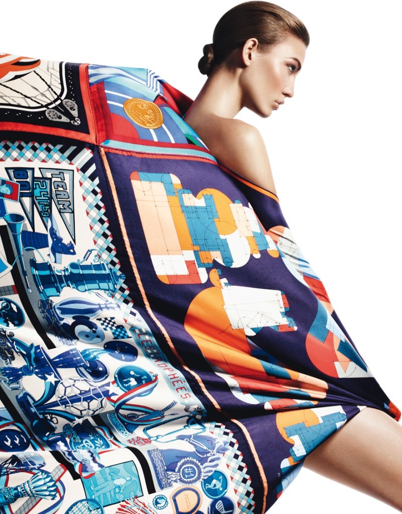 Популярный, в мире моды, бренд Hermes представил коллекцию ультра-модных платков сезона весна-лето 2013. В рекламной кампании новой линейки снялась американская модель Карли Клосс (Karlie Kloss). Фотограф Дэвид Симс запечатлел модель в движении, на фото девушка выглядит динамично, красиво, энергично. Каждое движение Клосс превращает платок из простого отреза таки, в нечто живое и самодостаточное. Платки от Hermes, как всегда пестрили яркими цветами, замысловатыми принтами и сказочными картинками. В общем, каждая из нас сможет подобрать, что - либо подходящее для себя в этой коллекции. Смотрим.