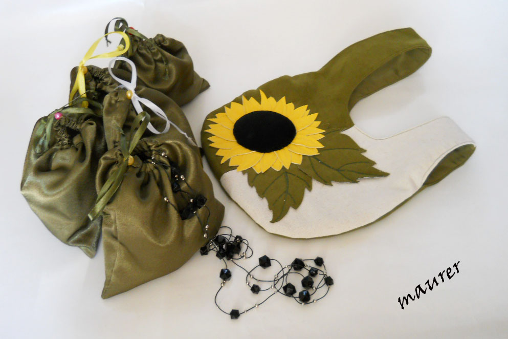 Сумочка "Японский узелок". Для маленькой девочки. В пяти мешочках будут храниться пять комплектов украшений для восточных танцев. Материалы: искусственная замша, парусина, кожзам, бархат. Подкладка: синтетика. Мешочки: креп-сатин. Размер сумочки: высота по центру 19см, ширина 27см. Вложение: