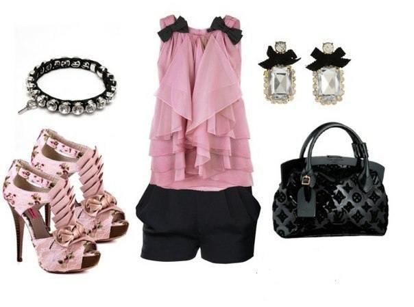 Мне все нравится, вот только шорты для меня очень короткие, босоножки очень красивые, серьги и браслет понравились, интересная задумка с бантиками.