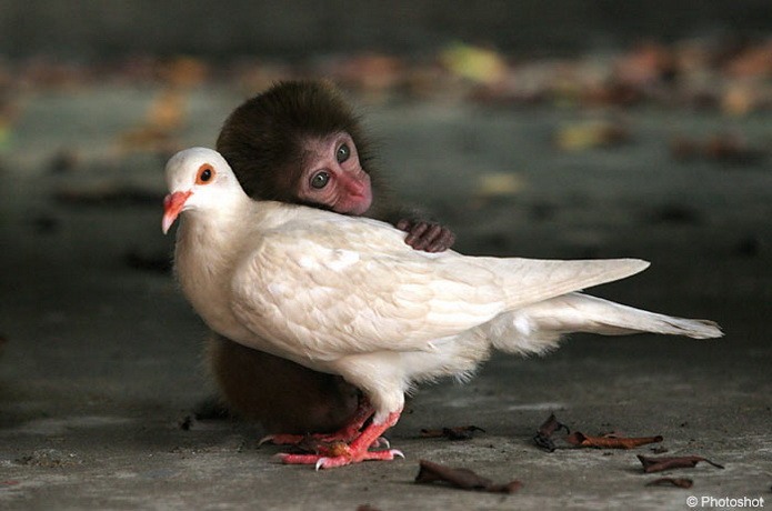 Меня удивила мама собака и детеныш тигренок, а также какая нежная обезьянка, так уж трепетно голубя обняла.