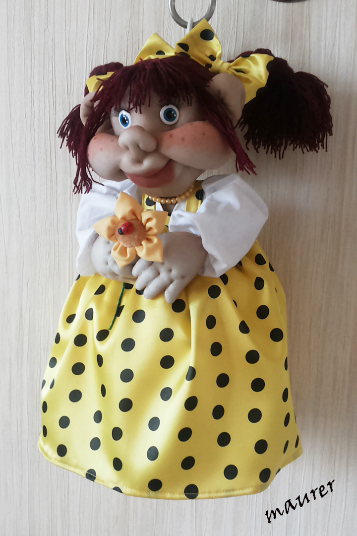 Кухонная пакетница. Рыжая девчушка.Подробности о пакетницах... Верхняя часть может выглядеть по-разному. Это может быть конопатая рыженькая девочка, пушистая заинька, деловой гусь, милая кошечка, забавная коровка, важная курочка или то, что Вы захотите. А нижняя часть-юбка и есть пакетницей. Сзади ниже пояса фартука находится отверствие, в которое складываются пакеты-маечки с частотой раз в несколько месяцев. Снизу юбка собрана на резинку и оставлено небольшое отверствие, через которое пакеты ежедневно и достаются. Вся эта конструкция длиной 40 см вешается на крючок на кухне в удобном месте на надежно закрепленную к шее и голове петельку. Значительно удобнее, чем поиски по ящикам чистого пакетика. Любая хозяйка оценит... Вложение:
