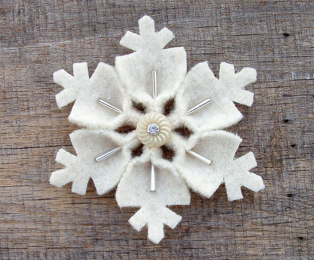 Можно сделать на новогоднюю елку снежинки с фетра. На бумаге рисуем шаблон "лепестка" снежинки и вырезаем. С помощью шаблона вырезаем из белого фетра шесть одинаковых "лепестков". Склеиваем или сшиваем их между собой. По желанию декорируем цветными нитками и бисером. Можно также сверху попрыскать лаком для волос с блестками.