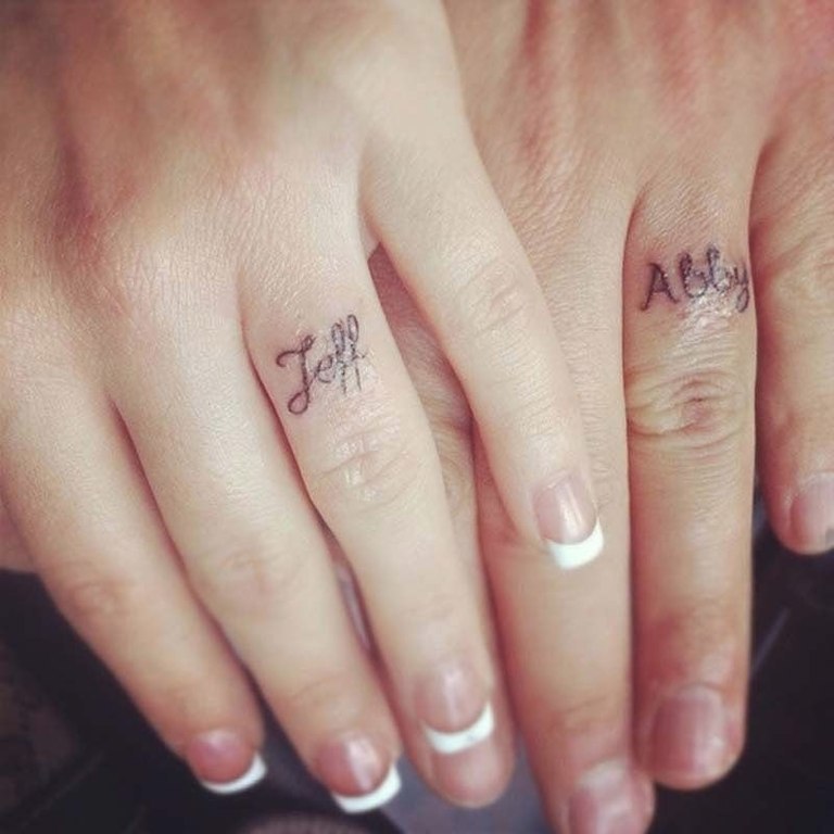 Сейчас все популярнее делать парные татуировки на безымянных пальцах, вместо колец носить, что говорит о любви друг к другу, некоторые имена набивают, но наши имена не представляю типа Александр и Людмила