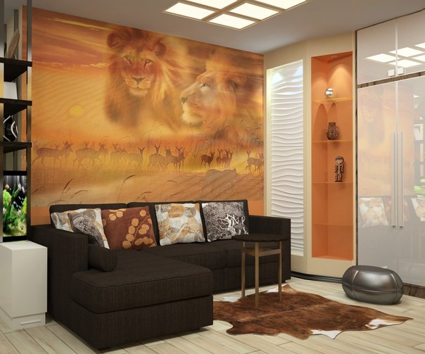 Мне идея в гостинной понравилась. Если полностью выдержать стиль "Сафари", то такие фотообои очень подходят.