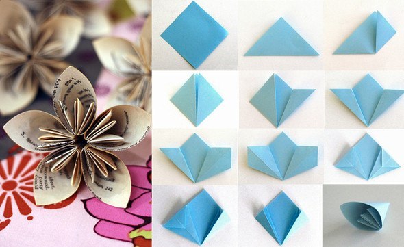 Розы интересные. Но мне нравятся более яркие цвета. А я умею делать вот такие цветы оригами из бумаги. Делала когда-то из них букетик в сине-голубых цветах , в серединку вставляла шарики из фольги. Получилось очень симпатично. А еще из этих цветов делают объемные шары, но я еще не пробовала. Вот делюсь схемой.