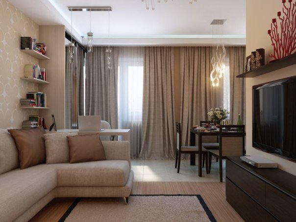 А мне понравилось еще вот такое решение, очень красиво, 1 комната разделена на зоны
