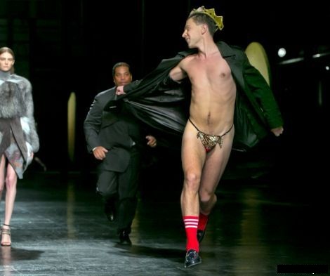 Известный своей скандальностю украинский журналист телеканала 1+1 Виталий Седюк сорвал показ на Неделе моды в Нью-Йорке, выбежавши на подиум в стрингах, черном плаще и красных носках. Так же на голове у эпатажного журналиста была корона, а в руках портрет Лео Дикаприо. В этот момент на подиуме проходил показ коллекции Брабала Гурунга, но дизайнер не стал злиться на журналиста. Более того на афтепати показа он пришел в короне Седюка, которую журналист забыл за кулисами, также в коронах пришли и гости вечеринки. Хорошо, что выходка Седюка прошла благополучно и обошлось без ареста. Охрана на показе, просто вывела назойливого журналиста из здания. Напомню, что Виталий Седюк пришел на церемонию вручения премии "Золотой глобус", которая состоялась 13 января в Лос-Анджелесе, с огромным плакатом, где изображены побитые украинцы. Вот таким весьма оригинальным способом прославляются наши журналисты на весь мир.