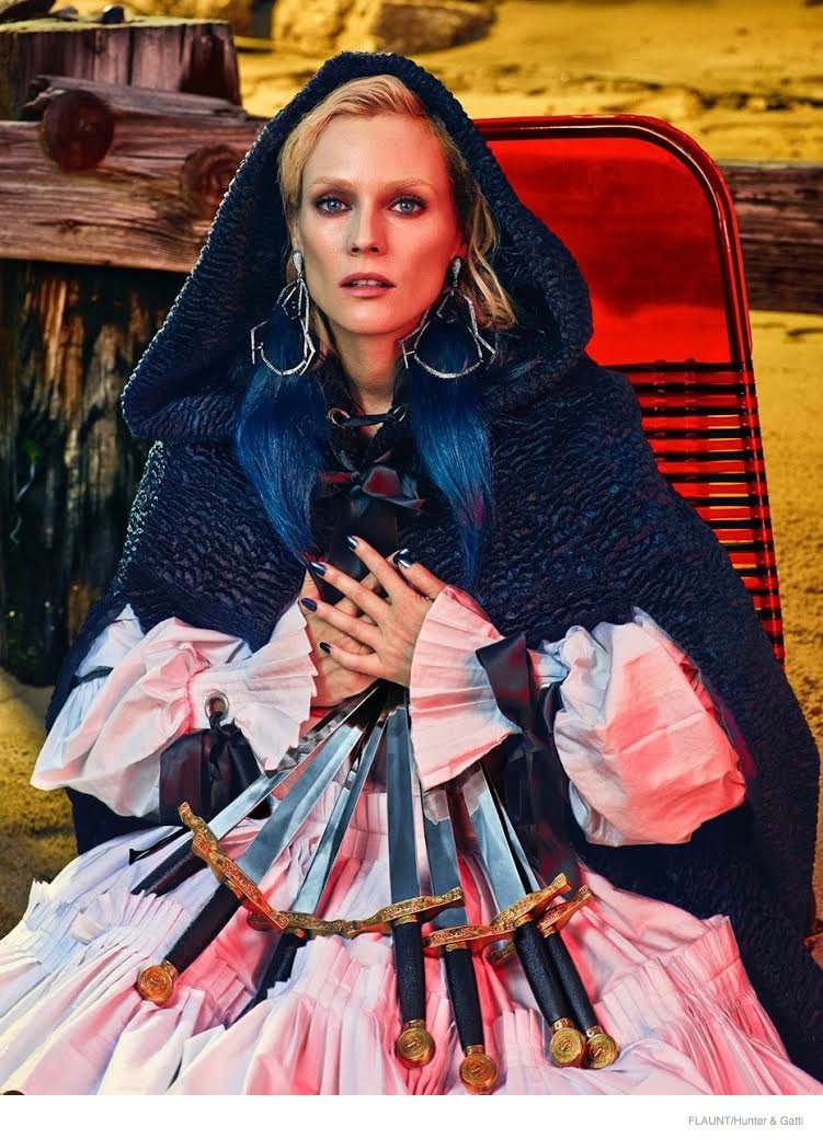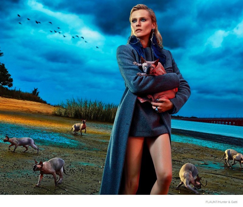 Известная немецкая актриса и модель Диана Крюгер решила вернуться к модельным корням и принять участие в фотосессии для декабрьского выпуска издания Flaunt. Фотосессия получилась очень необычной, если так сильно не присматриваться, то можно и не понять, что на фото именно Диана. Ее практически не узнать, на снимках актриса блистает с «влажной укладкой», с выразительным макияжем глаз, который очень изменил образ Крюгер. В фотосете актриса позирует не одна, а с одними из самых необычных котов – сфинксами. Это не удивительно, ведь новый номер журнала выйдет под слоганом «Девять жизней». На снимках Дина Крюгер красуется в нарядах из перьев и кожи, «средневековых» платьях и больших свитерах, горит пламенем, позирует с кинжалами. В общем не соскучишься, думаю вам будет на что посмотреть.