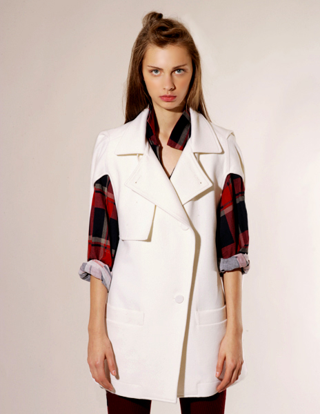 Белое пальтишко и впрямь похоже на пиджачок без рукавов. Такой стильный... Я бы сказала, что он классический, если бы не видела какую, довольно обычную клетчатую рубашечку под него одели... А выглядит очень классно. Вообще люблю вещи, которые можно сочетать как со строгой, классической одеждой, так и с повседневной...Универсально получается.