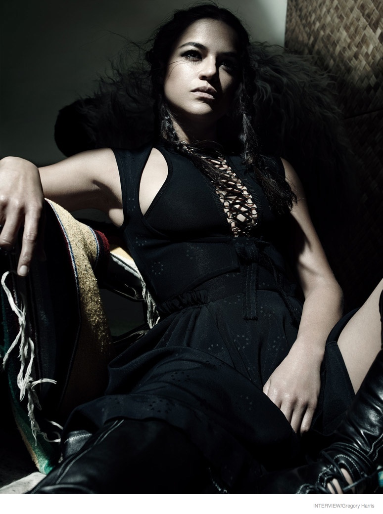 Давно мы все не слышали о звезде популярного экшина «Форсаж» актрисе Мишель Родригес. Эта девушка многим известна не только своими ролями, но и своим имиджем «плохой» девочки. Актриса встречалась с секс-символом Заком Эфроном, а потом имела тесные отношения с моделью Карой Делевиль. Последняя, кстати, вполне откровенно заявляла о своей бисексуальности. Но в скором времени мы с вами снова сможем увидеть Мишель на экранах, ведь не так уже долго осталось до премьеры седьмой части «Форсажа», в которой актриса будет играть главную роль. А пока мы ждем, то можем полюбоваться Мишель Родригес на страницах издания Interview Magazine. Думаю эта фотосессия, как раз и приурочена выходу очередной части популярного фильма. Фотосет проходил в духе глэм-рока, Родригес позирует в стильных платьях, белье и укороченных жакетах. На фото она сохраняет свой естественный немного грустный и невозмутимый вид. Я очень жду продолжения фильма "Форсаж", и так же хочу увидеть в нем Мишель. А что скажут наши форумчанки?