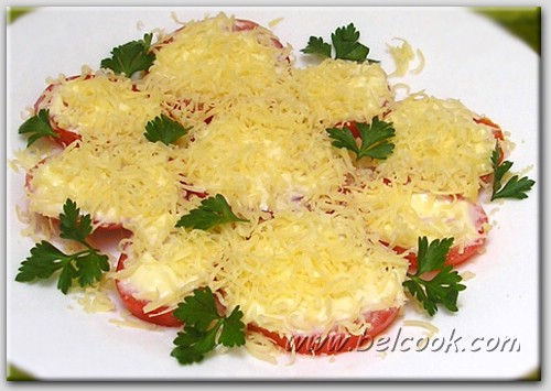 я не очень люблю сыр...а тем более в салатах, единственное что люблю...это помидоры порезать кружочками, потом сверху майонез с чесноком, и сверху натереть сыр... Вложение:
