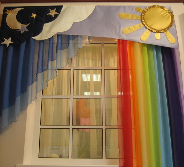 с шторaми комнaтa смотрится уютнeй...дa и стирaть их нe сложно. Мнe очeнь понрaвились шторы с рaдугой...тaкиe яркиe)