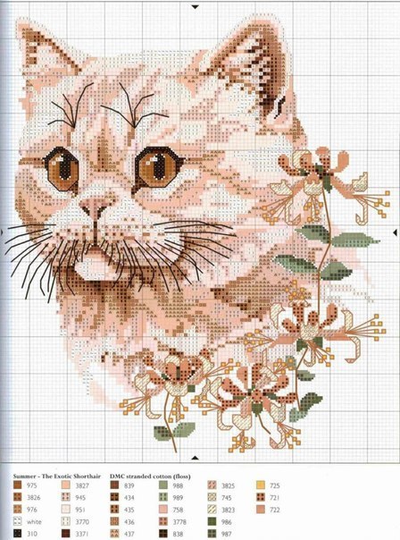 Мне коты, где крупная морда с цветочками сбоку очень понравились. Таких можно вышить и на картинки, и на подушки. А как вам такой кот в цветочках?