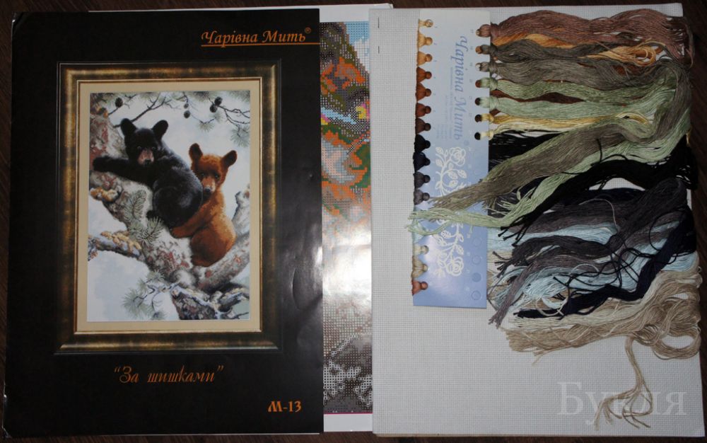 На моем наборе с гусями были еще представлены варианты вышивок в такой же тематике. Из них мне очень понравились "За шишками" - парочка медвежат на дереве. Муж правда говорит, что по настоящему межвежата должны быть одинаковыми по цвету. А как на меня, то намного интереснее смотрится когда один черный, а второй бурый. Я даже и схему такую нашла, но только нет номеров ниток, а самому подобрать сложно. Вложение: