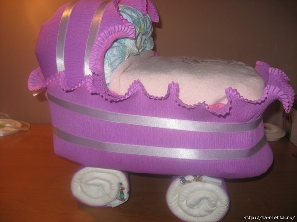 Это коляска из памперсов,сверху обтянута гафро бумагой, интересно сделано, думаю можно справится самостоятельно. Вот еще  сипеды из памперсов мастерят, тоже красиво очень