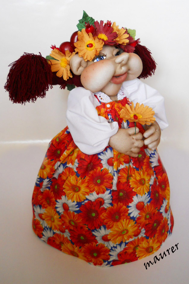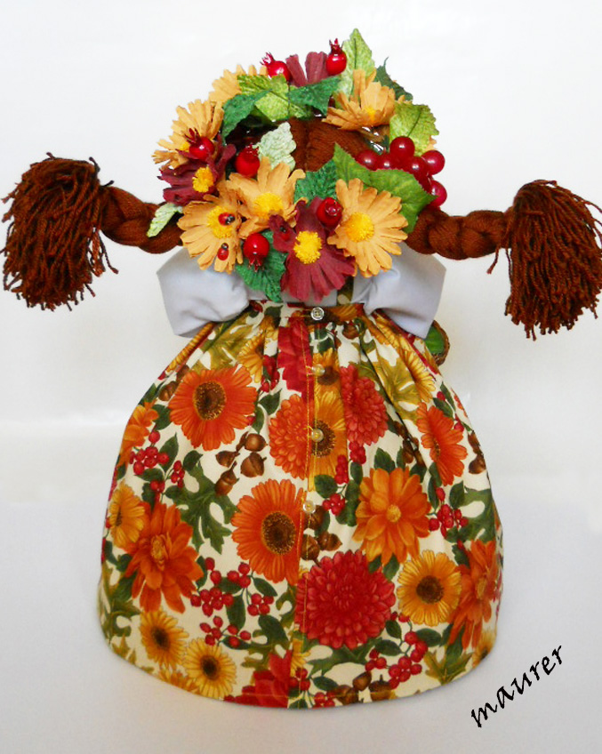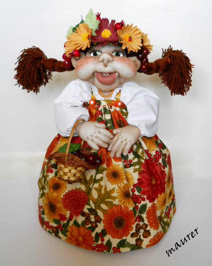 Осень вдохновила меня на создание этой девушки. Кухонная кукла-грелка. Высота около 50см. Материалы: бязь, поплин, ватин, синтепон, капрон. Два слоя ватина сохранят тепло чайника или кастрюли долго. Вся одежда съемная. Вложение: