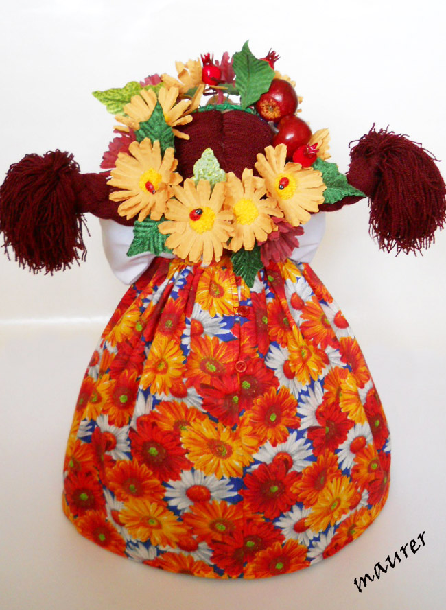 Кукла-грелка "Осень". Задумывался этот образ давно, воплощался долго... А хозяйка нашлась ей даже раньше, чем я закончила куклу. Сарафан из американского хлопка. Из него же была сумочка "Вересень". Ткани этой больше нет. И кукла и сумка останутся эксклюзивом. Высота около 50см. Вся одежда съемная. Вложение: