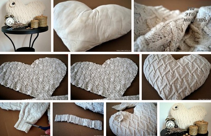 Из старого свитера можно сшить подушку любимому на валентинки, она получится теплой и очень милой