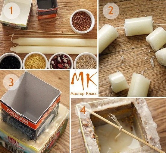 Можно сделать свечу своими руками для кухни. Понадобится: -две обычные свечки из воска, -две небольшие коробочки разного размера (желательно обе квадратные), -разные крупы - гречка, фасоль, горох, кукуруза, пшено и др, -деревянные шпажки. Свечи надо поломать на небольшие кусочки и аккуратно снять с фитиля. Фитиль сохранить. Воск растопить на водяной бане. Далее вкладываем маленькую коробочку в большую. Промежутки между коробочками засыпаем не большим слоем крупы, затем заливаем растопленным воском, быстро насыпаем следующий слой зерен и опять заливаем воском. Повторяем процедуру до тех пор, пока промежутки полностью не заполнятся. Оставляем изделие охлаждаться. Аккуратно вытаскиваем внутреннюю коробочку. Наливаем на дно немного растопленного воска и закрепляем конец фитиля. Второй конец привязываем к деревянной шпажке, так, чтобы он находился по центру и свисал ровно. Заливаем растопленным воском и полностью охлаждаем (можно поставить свечку в холодильник на 15-20 минут). Вложение: