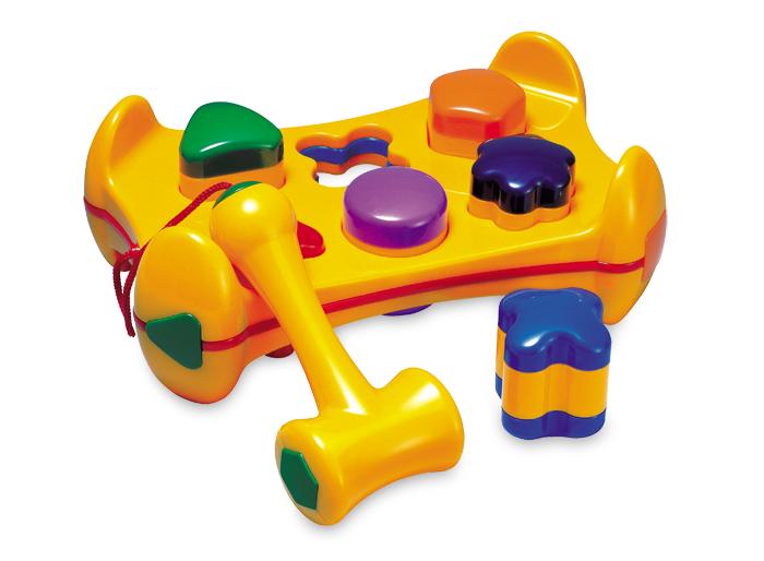 Им можно пользоваться и без молотка. Сначала мы просто вкладвали формочки, а через пару месяцев стали забивать молотком. Этот молоток прорезиненый. Им очень тяжело приченить себе вред. Для совсем маленьких можно взять мягкий сортер.