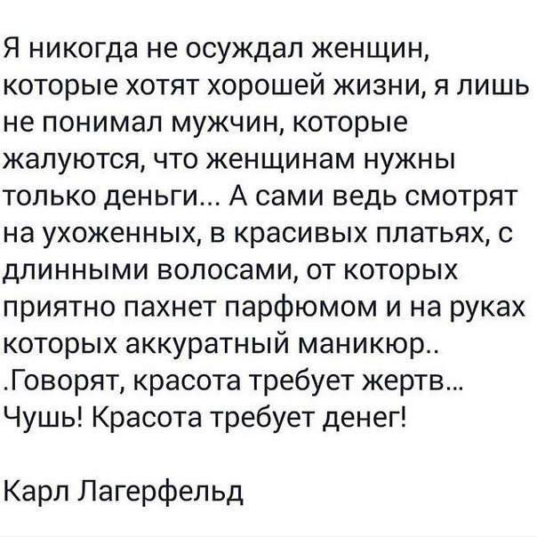 Я считаю очень правильным при наличии у самой женщины головы на плечах, чтобы муж не был против ее трат на собственный внешний вид. Потому что реально, все ВСЕ мужчины любят ухоженных, свеженьких женщин, а чем старше - тем дороже женщине обходится поддержание своей "цветущей" формы. Конечно, когда денег нет и на еду, о красоте мало кто думает, но если финансы позволяют хоть немного тратить на себя - то на это надо тратить деньги.