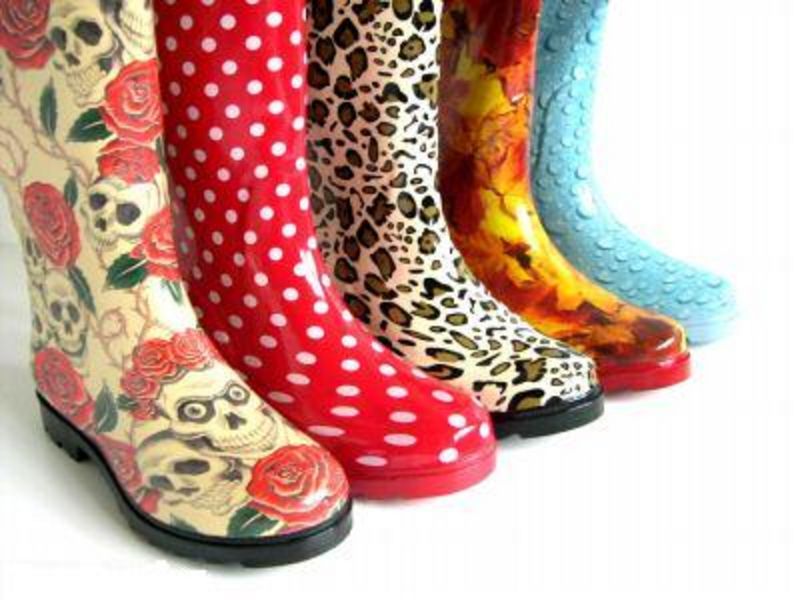 Смотрите, какие резиновые сапоги интересные. Я всегда их причисляла к спортивной обуви, а с такой расцветкой даже и не знаю, с чем можно обуть. И сумочку в таком стиле подобрать можно. Хотя, если и сапоги и сука вместе, то это уже слишком, по-моему!