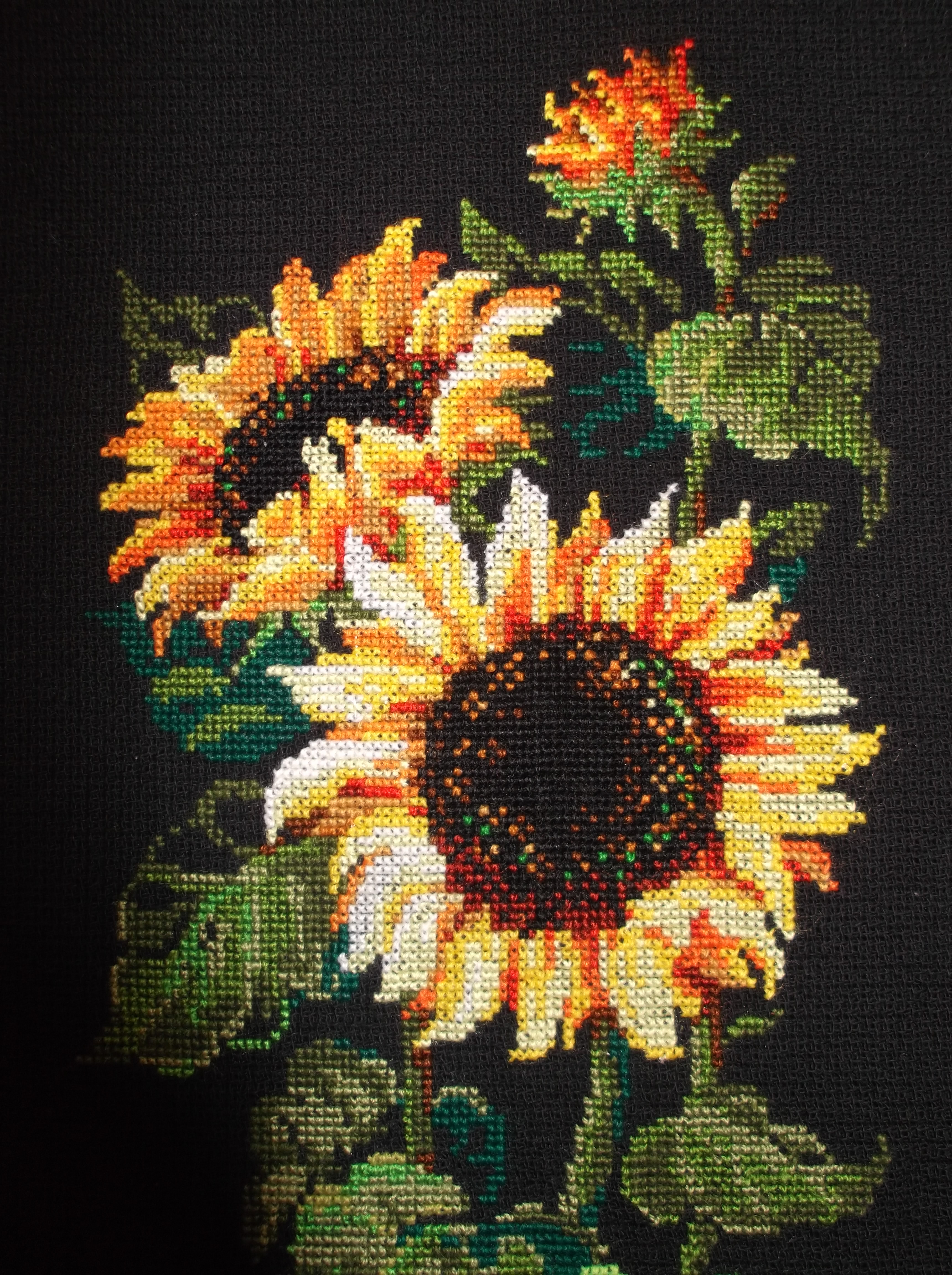 Мне б начать еще))) Подсолнухи вчера закончила. Ушло примерно 3 недели, но я вышивала не каждый день. Надеюсь, что примерно за столько вышью и маки. А потом уже возьмусь и за гусей. Это будет мужу в подарок.