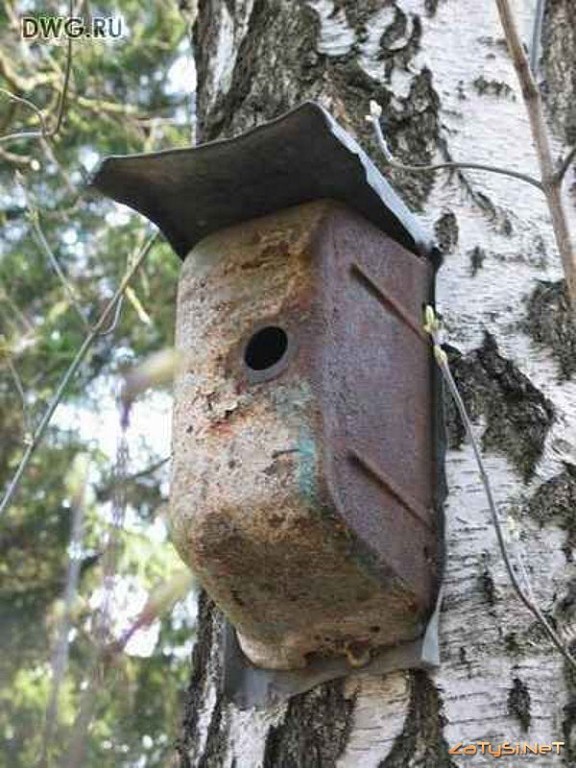viter писал(а): Цитата: Подивіться як цікаво придумали. Я довго дивилась і не могла зрозуміти з чого це зроблено Придумано креативно, бесспорно, только для вопрос-зачем навес сверху над бачком-скворечником? Так птичка сидит в дозоре, и вроде как бы на голову не капает, в не погоду