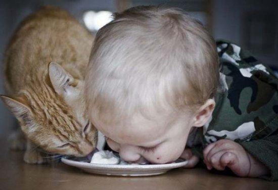 Снимок, конечно, вызывает умиление, но я бы тоже не разрешила есть ребенку с одной тарелки с кошкой. Хотя дочка не раз пробовала кошачий корм, когда я упускала ее с глаз.