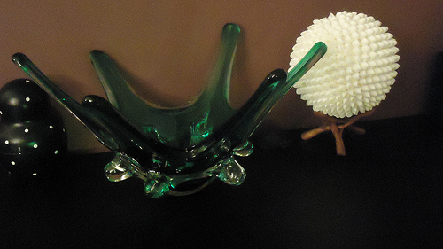 Покажу кое-какие детали интерьера:) Необычная зеленая ваза, которую купили в антикварном магазине (кстати одна единственная в мире в таком цвете, была сделана кажется в 20е годы прошлого века), и белый шар из ракушек, который мы привезли с Мальдив.