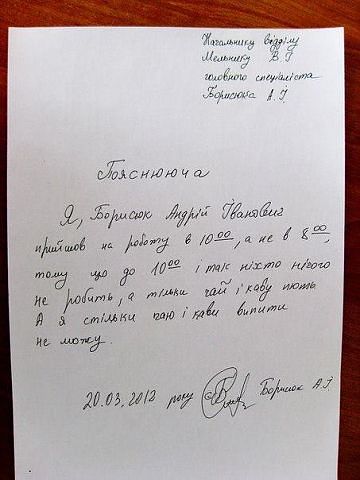 ПНВ писал(а): А в такое верите? Или, думаете, что обманка? А почему бы и нет? Я хочу сказать что предприятие предприятию рознь, вот например есть начальники которые сидят с подчиненным в одном кабинете и пребывают с ним в отличных отношениях, а если такой подчиненный опоздает, то начальник в шутку скажет ему писать обьяснительную, а тотв шутку напишет что угодно, зная что безнаказанно)