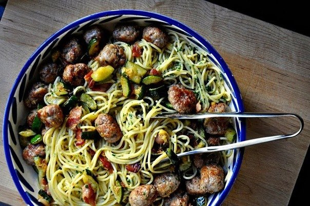 А меня впечатлил рецепт карбонары с цуккини и фрикадельками, кто - то такое делал? 500 гр спагетти сварить, 2 цуккини нарезать на четвертинки, из 400 гр фарша скатать шарики. Мясные шарики обжарить на сковороде около 5 минут, добавить цукини и 4 кусочка бекона, жарить пока бекон не станет хрустящим. Отделить желтки от белков в 4 яйцах и взбить. Цедру 1 лимона натереть на терке, нарезать пол стакана петрушки. Петрушку и 100гр тертого сыра добавить к желткам, взбить. Выложить спагетти, залить желтками и выложить наверх фрикадельки с цукини.