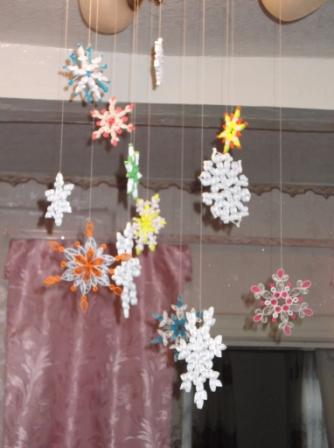 Я этой зимой тоже попробовала сделать что-то в технике квиллинг. Получились вот такие снежинки, которые украсили люстру в новогоднии праздники: