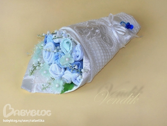 мне нравиться когда на рождение ребенка дарят букеты из детской одежды. очень мило получается. посмотрела МК, теперь хочу попробовать для подруги сделать